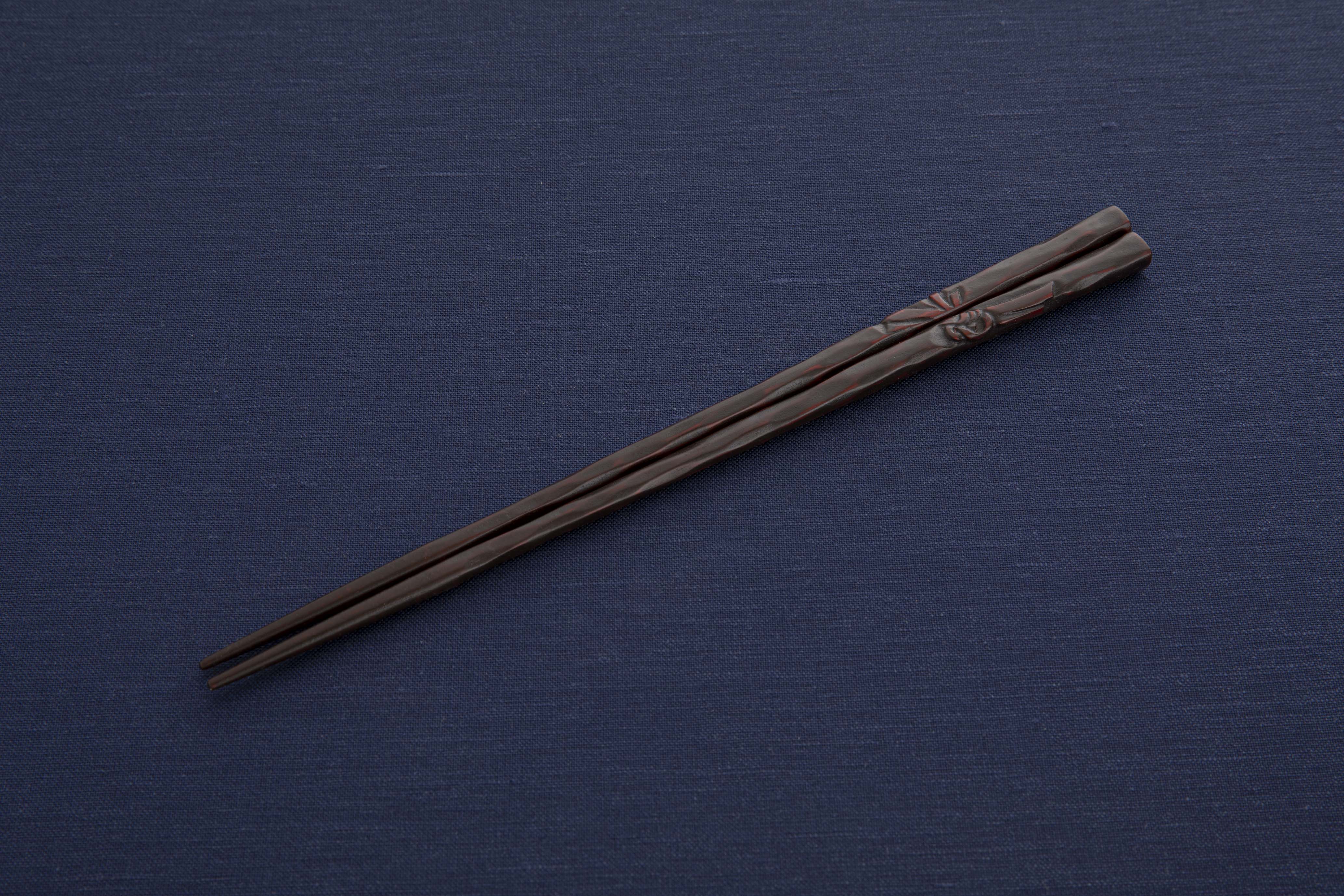 鎌倉彫らしい漆と彫刻刀のみで仕上げた木地に、結び目の彫りが浮かび上がります。お柄は、末永く結ばれてとの願いから左右一対で結びの模様が完成。ご結婚のお祝いや様々な贈り物に最適のお品です。箸は専用の箱に入れてお届けいたします(箱入りの写真はイメージです。実際の商品とは異なります)