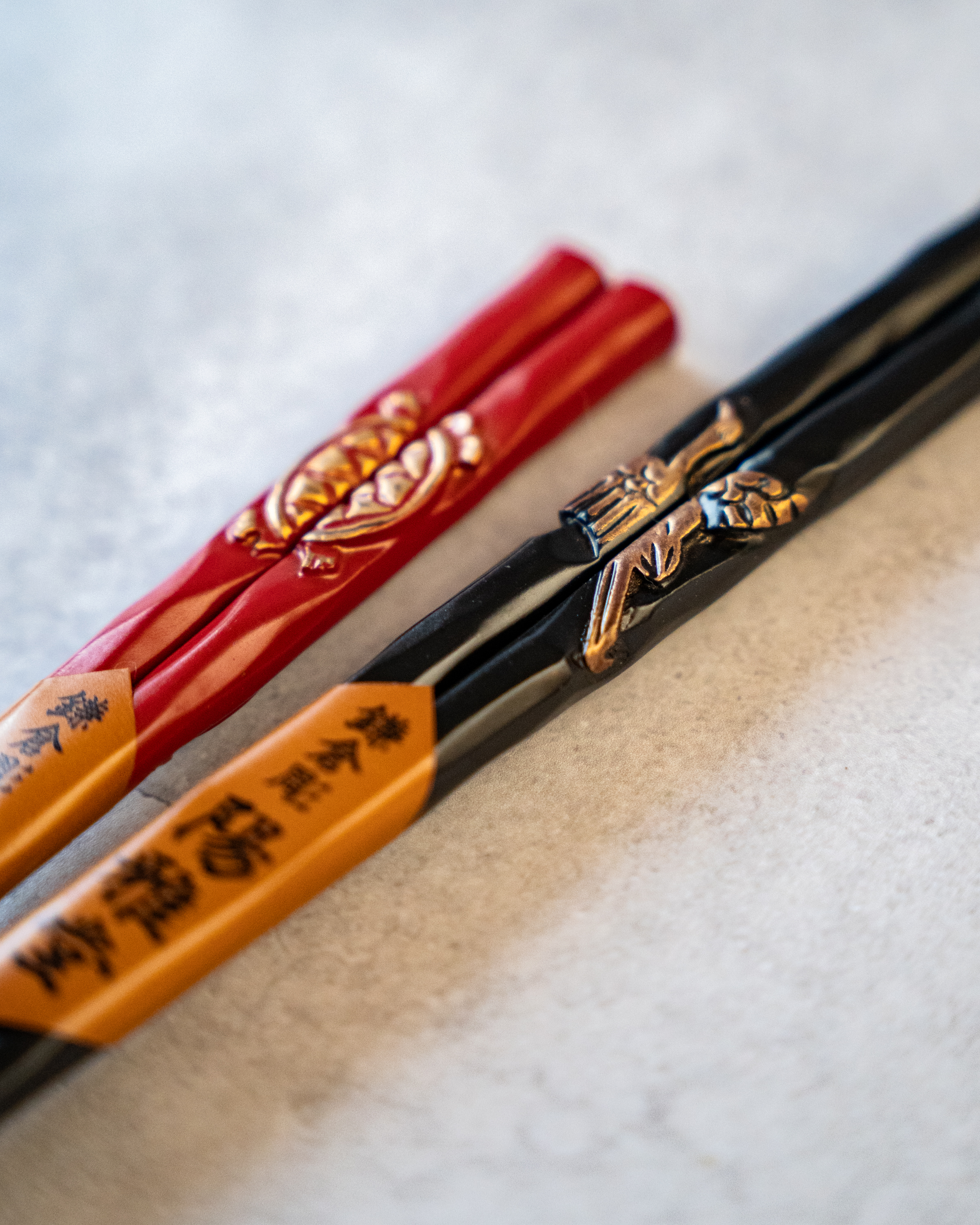 亀の文様が入った朱漆箸と、または鶴の文様が入った朱漆箸とセットになった商品もございます。