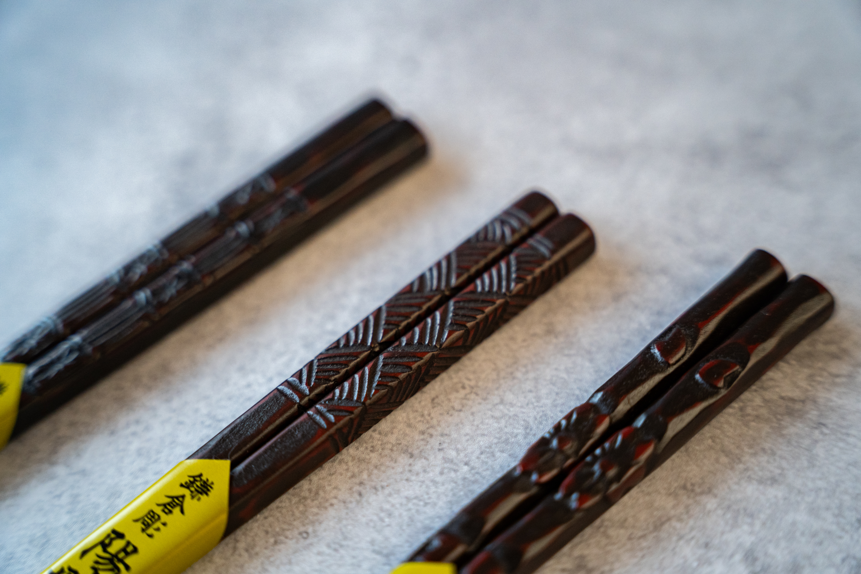 鎌倉彫らしいお色と風合いをお楽しみいただける乾口塗りのお箸です。建具にも使われる伝統的な編み文様をお箸にデザインしました。飽きのこないどなたにも喜ばれるお柄です。