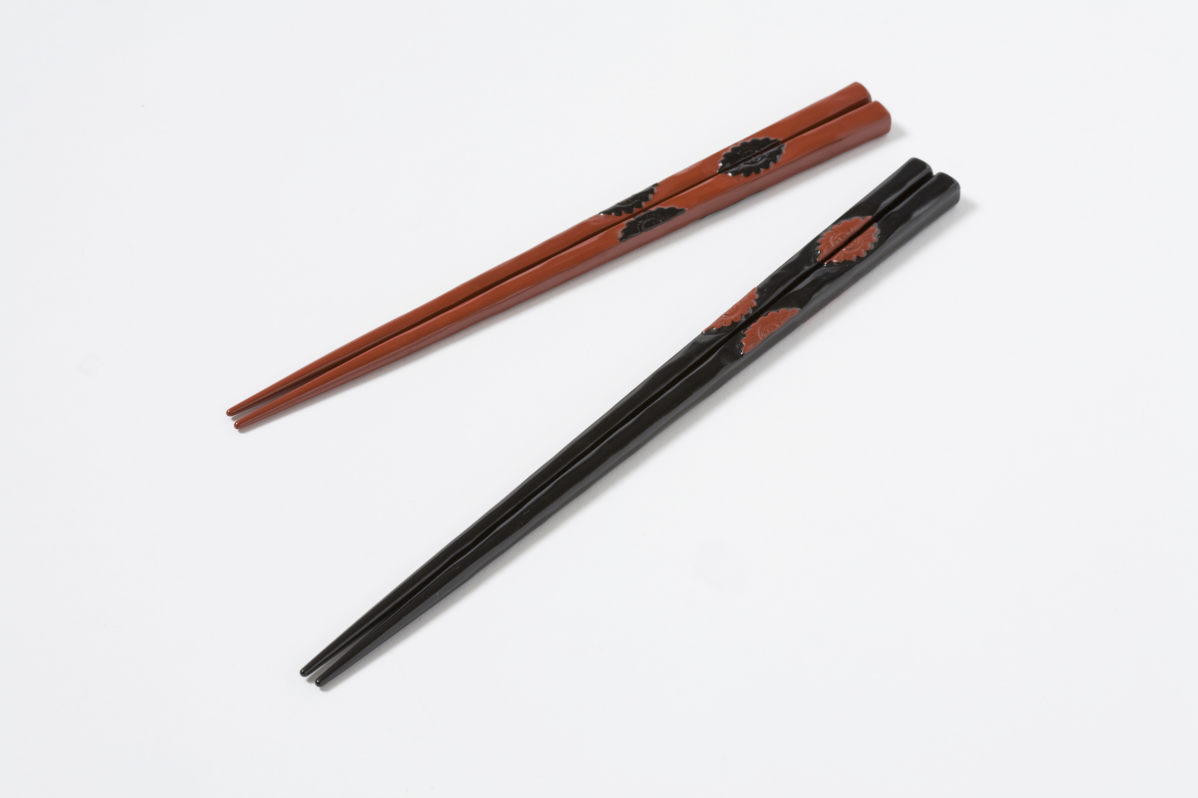 朱と黒の漆で光沢を持たせ、華やかに仕上げました。お柄は不老長寿を願う、愛らしい吉祥文様の菊です。箸の裏側にも菊のお柄を施しました。