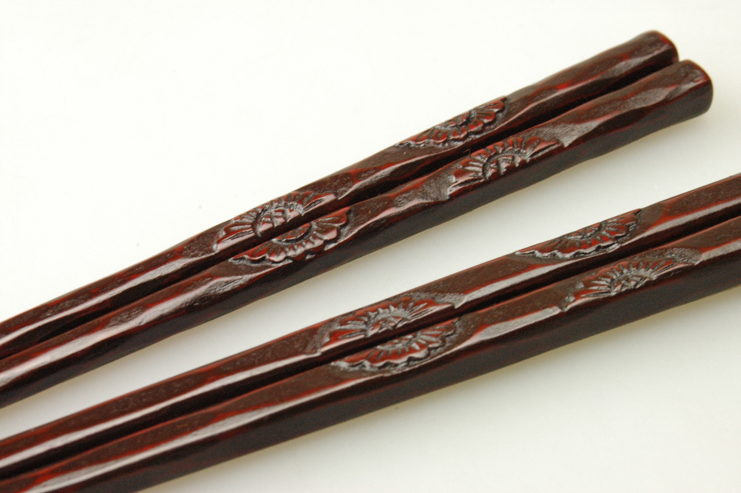 菊は古くから重陽の節句で用いられ、長寿を祈る吉祥文。鎌倉彫らしいお色と風合いをお楽しみいただける乾口塗りのお箸です。
