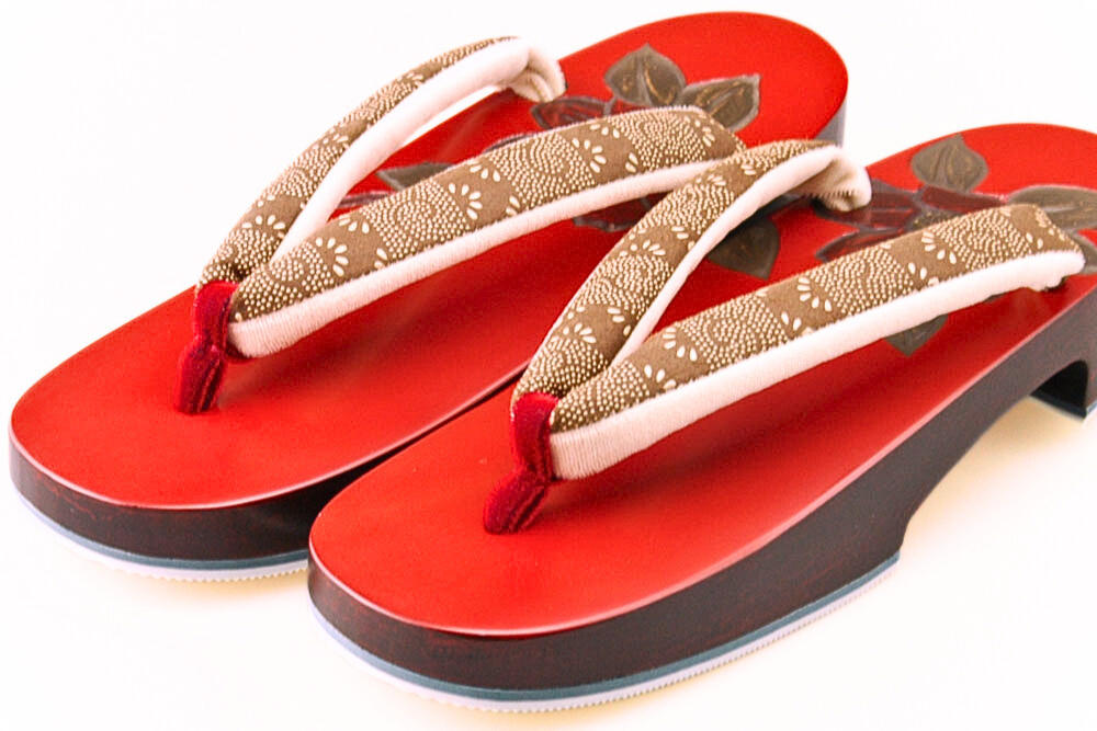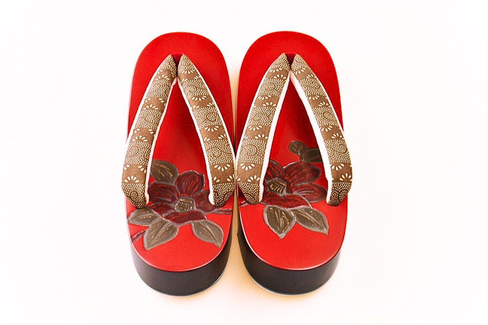 朱漆塗り、艶やかな台に「椿」の彫です。鼻緒「本家印傳屋オリジナル」本印伝福林使用