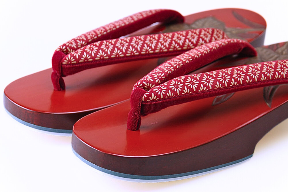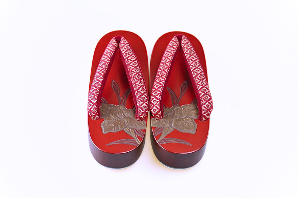 艶やかな漆の面に「あやめ」のお柄を彫りました。鎌倉彫本消し右近 朱漆塗り、鼻緒「本家印傳屋オリジナル」本印伝福林使用