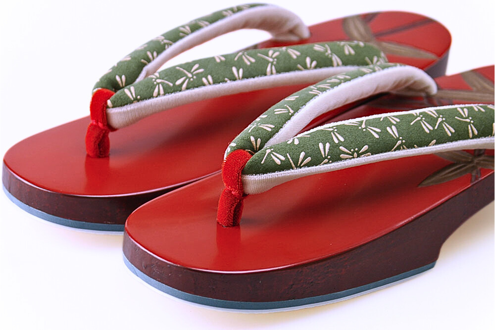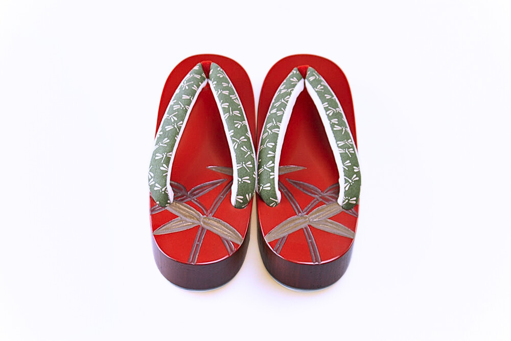 艶やかな漆の台に「笹竹」のお柄を彫りました。鎌倉彫本消し右近 朱漆塗り、鼻緒「本家印傳屋オリジナル」本印伝福林使用