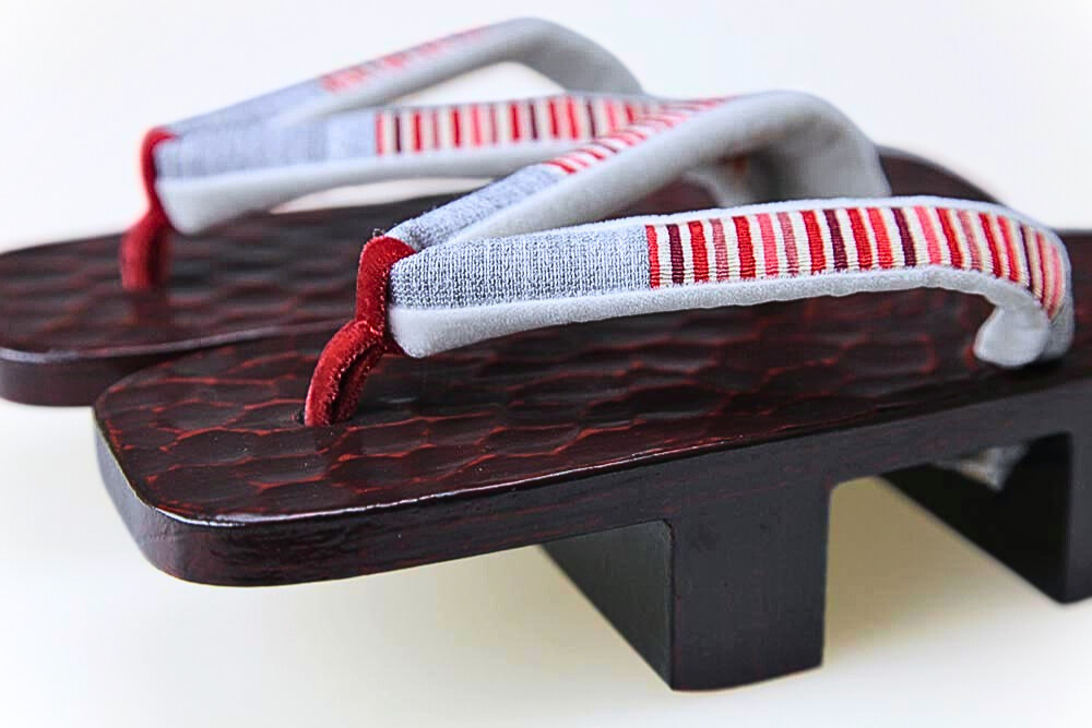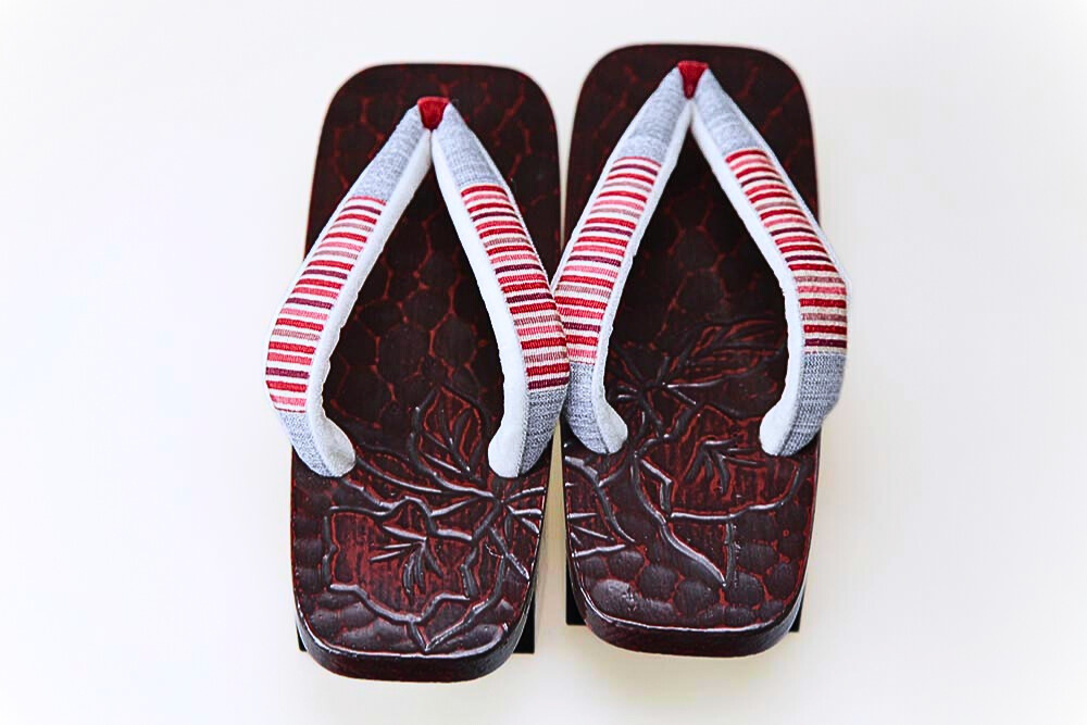 鎌倉彫らしい刀痕を残した台の芳町(二本歯)タイプ。鼻緒は鮮やかなボーダー柄で、お下駄初心者の方にも馴染みやすいデザインです。当店では、図柄・サイズ 共に数多く取り扱っております。