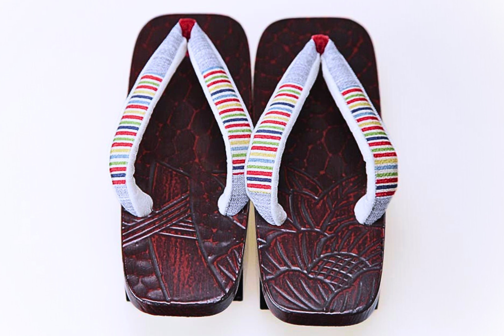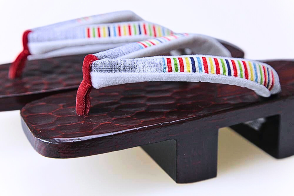 鎌倉彫らしい刀痕を残した台の芳町(二本歯)タイプ。鼻緒は鮮やかなボーダー柄で、お下駄初心者の方にも馴染みやすいデザインです。当店では、図柄・サイズ 共に数多く取り扱っております。