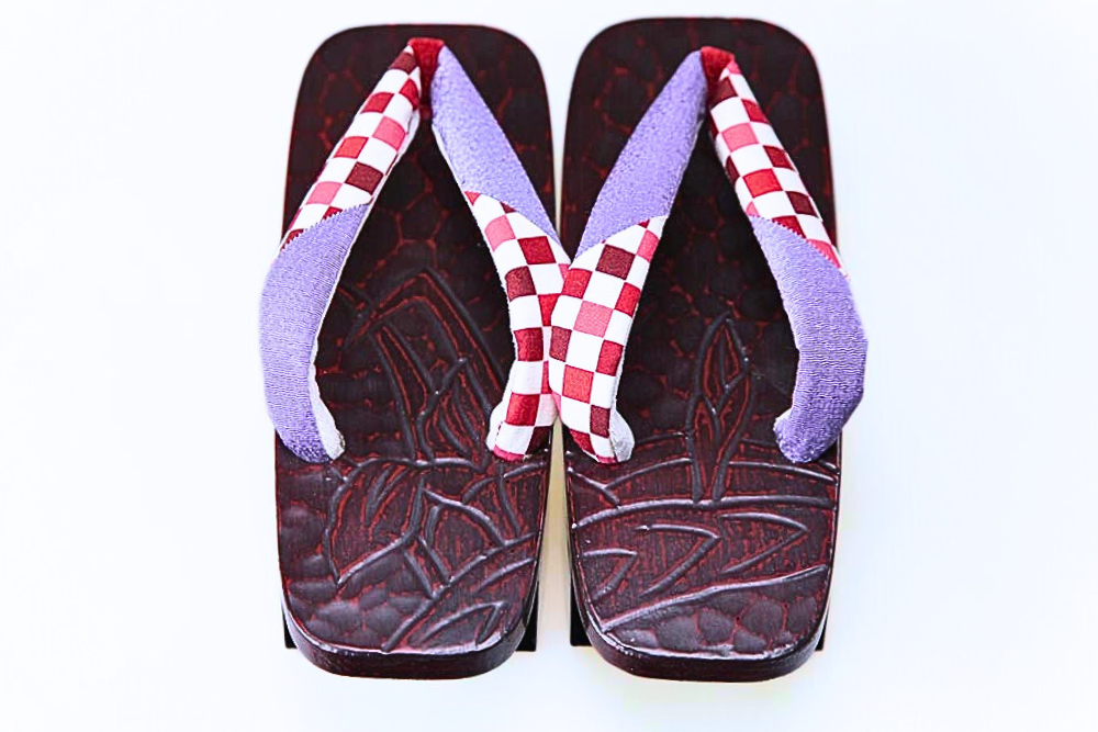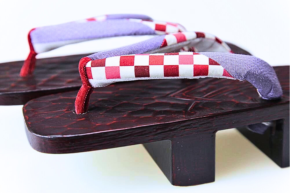 鎌倉彫らしい刀痕を残した台の芳町(二本歯)タイプ。鼻緒は鮮やかな市松模様で、お下駄初心者の方にも馴染みやすいデザインです。当店では、図柄・サイズ 共に数多く取り扱っております。
