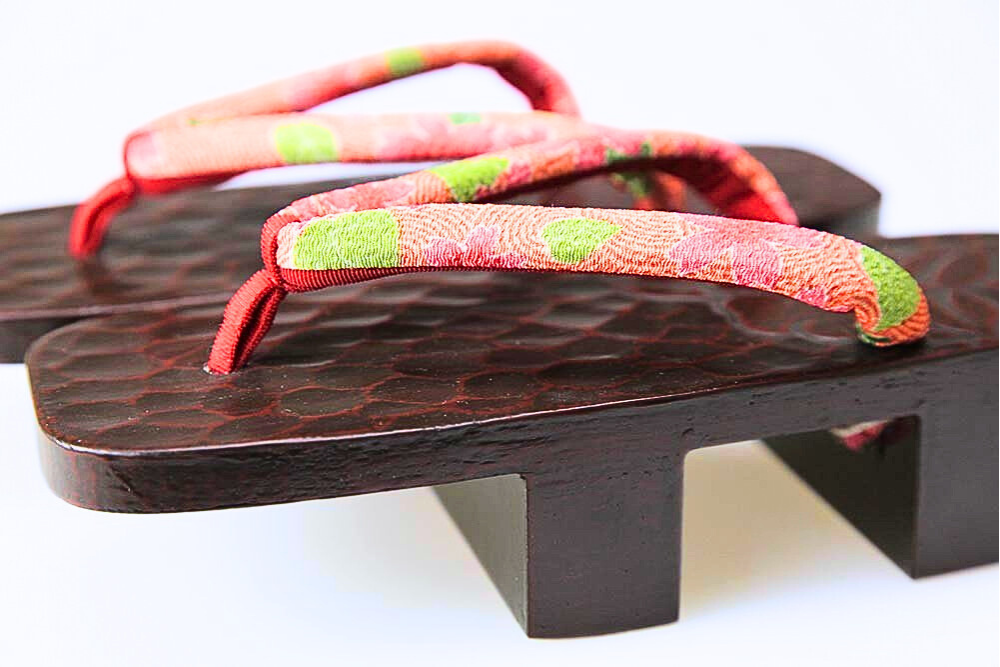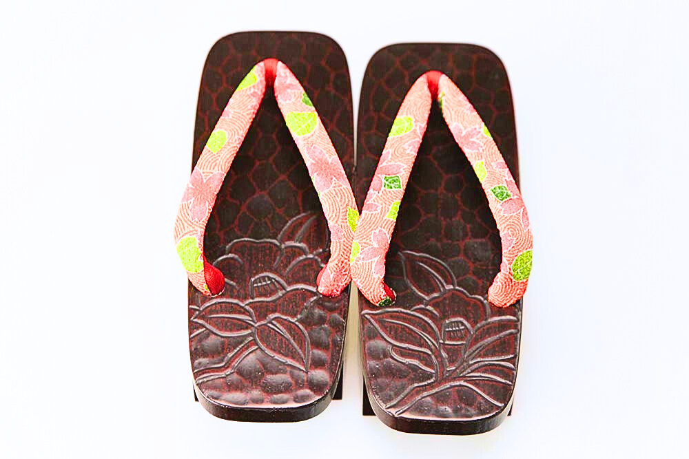 鎌倉彫らしい刀痕を残した台の芳町(二本歯)タイプ。鼻緒は鮮やかな桜紋様で、お下駄初心者の方にも馴染みやすいデザインです。当店では、図柄・サイズ 共に数多く取り扱っております。