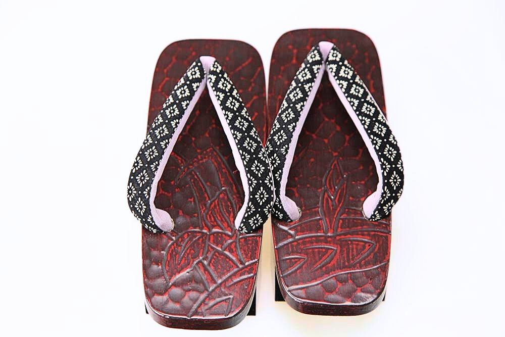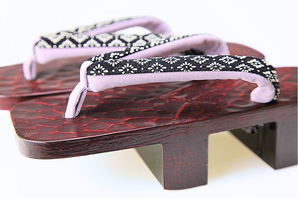 鎌倉彫らしい刀痕を残した台の芳町(二本歯)タイプ。鼻緒は鮮やかな印伝風の柄で、お下駄初心者の方にも馴染みやすいデザインです。当店では、図柄・サイズ 共に数多く取り扱っております。