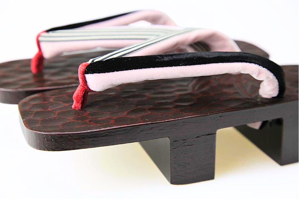 鎌倉彫らしい刀痕を残した台の芳町(二本歯)タイプ。鼻緒は鮮やかなストライプ柄で、お下駄初心者の方にも馴染みやすいデザインです。当店では、図柄・サイズ 共に数多く取り扱っております。