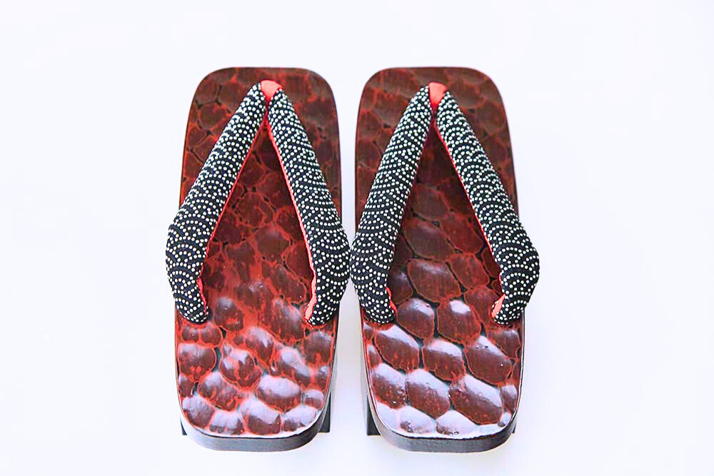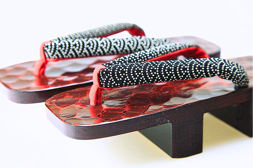 鎌倉彫らしい大きな刀目柄が施されたシンプルなお下駄です。鮮やかな鼻緒の組合せが粋なデザインとなっております。