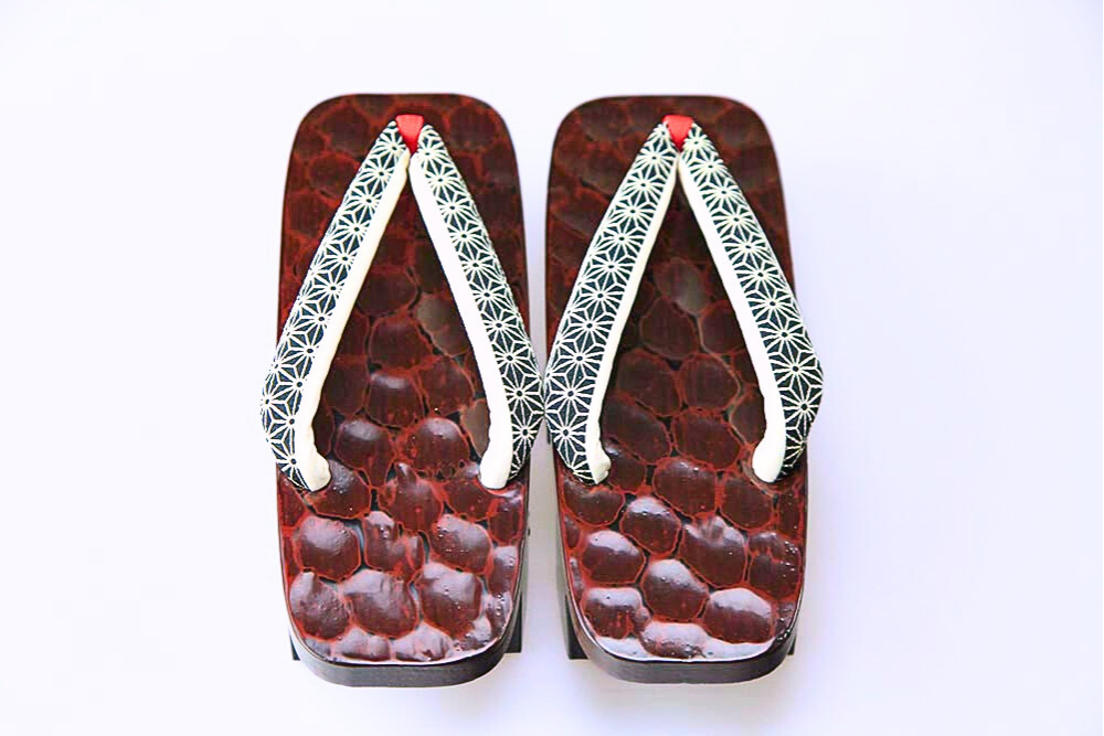 鎌倉彫らしい大きな刀目柄が施されたシンプルなお下駄です。鮮やかな鼻緒の組合せが粋なデザインとなっております。