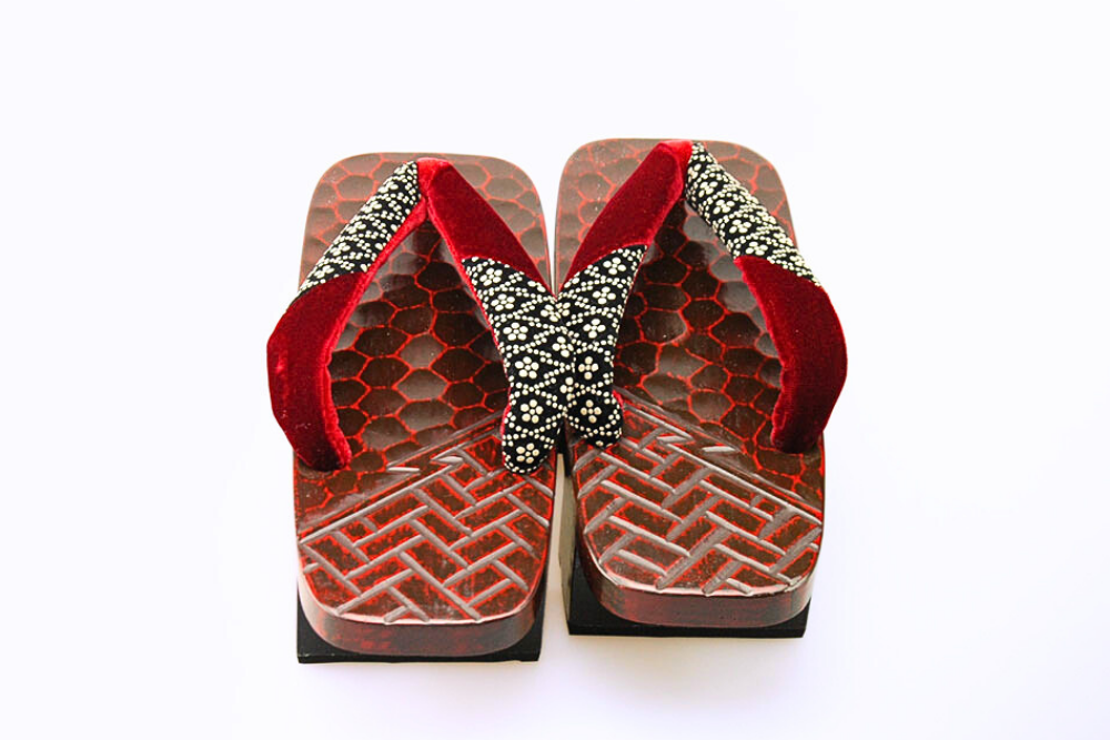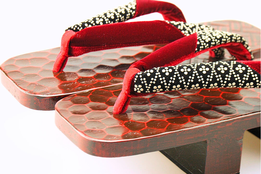 鎌倉彫らしい刀痕を残した台の芳町(二本歯)タイプ。鼻緒は江戸褄 (羽衣天)ソフトな履き心地で、お下駄初心者の方にも馴染みやすいデザインです。当店では、図柄・サイズ 共に数多く取り扱っております。