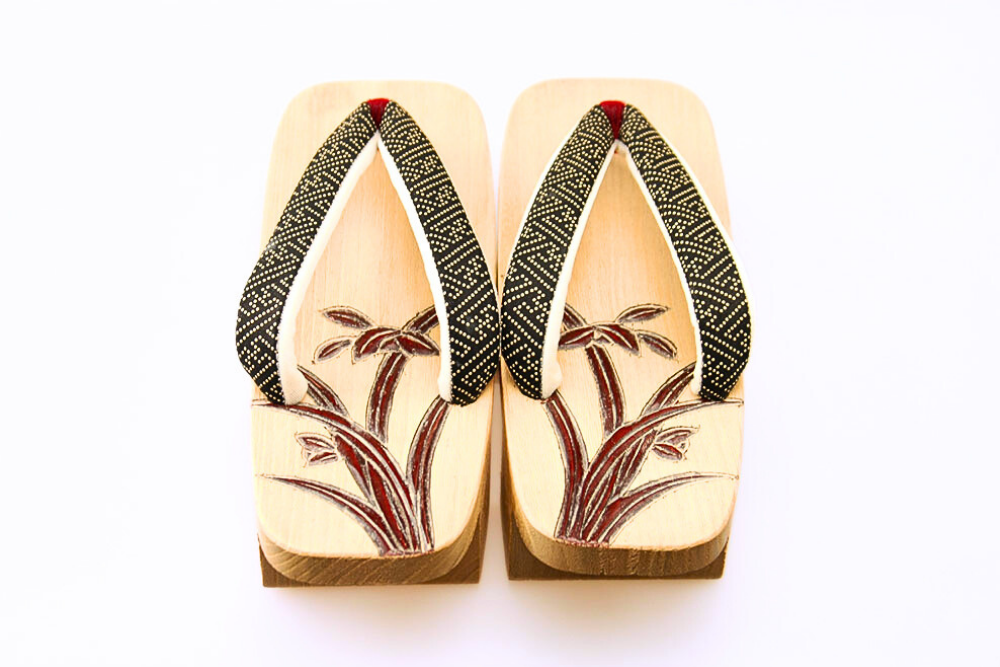 桐下駄の白木の柾目そのままを生かした上に、鎌倉彫の彫と漆で柄を刻んだ個性的なデザイン。白木に汚れが付きにくいよう磨きを施してあります。浴衣の他、紬・ウール・小紋にもお使いいただけるほか日常のお服の足元にも粋です