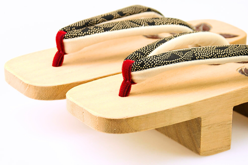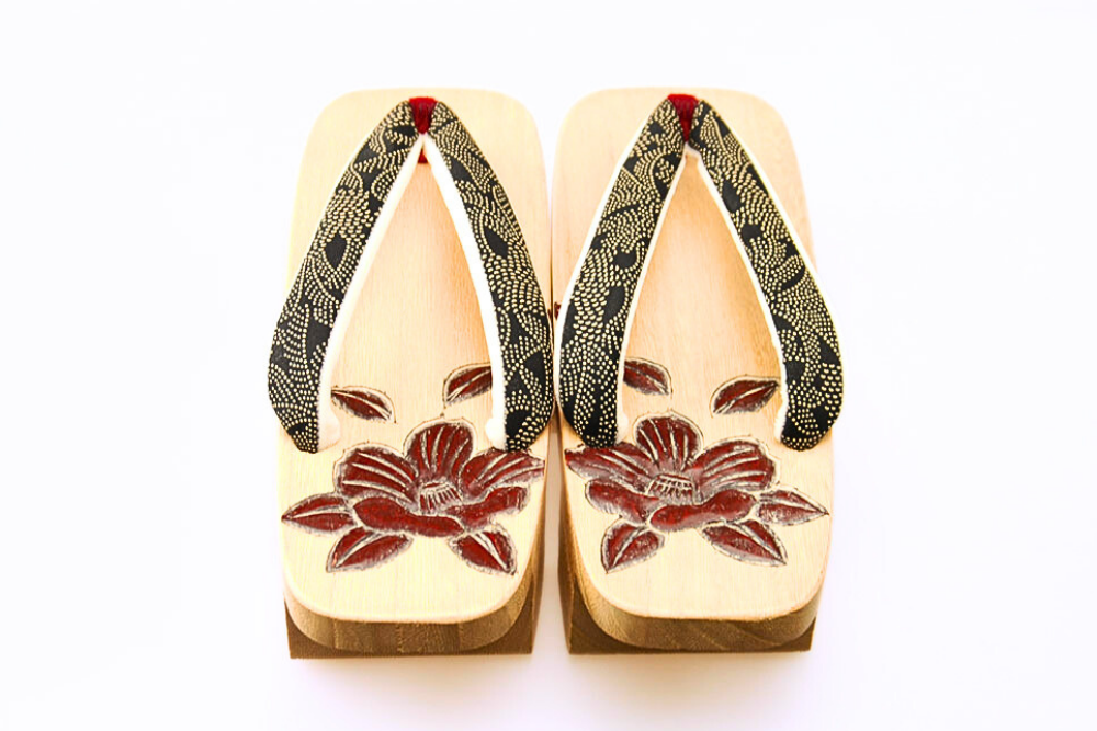 桐下駄の白木の柾目そのままを生かした上に、鎌倉彫の彫と漆で柄を刻んだ個性的なデザイン。白木に汚れが付きにくいよう磨きを施してあります。浴衣の他、紬・ウール・小紋にもお使いいただけるほか日常のお服の足元にも粋です