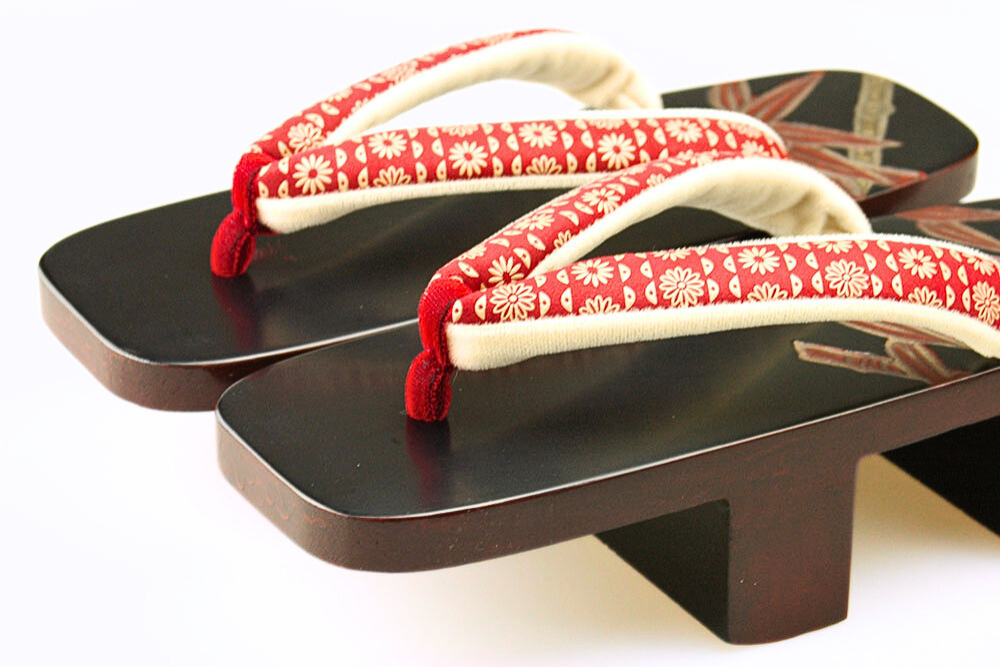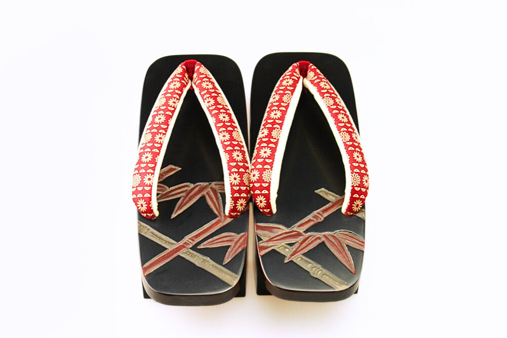 SOLD OUT黒漆塗り、艶やかな台に「笹竹」の彫です。鼻緒「本家印傳屋オリジナル」本印伝福林使用*別柄の在庫はございます。お問合せください