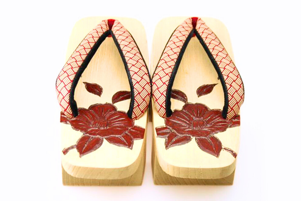 桐下駄の白木の柾目そのままを生かした上に、鎌倉彫の彫と漆で柄を刻んだ個性的なデザイン。白木に汚れが付きにくいよう磨きを施してあります。浴衣の他、紬・ウール・小紋にもお使いいただけるほか日常のお服の足元にも粋です