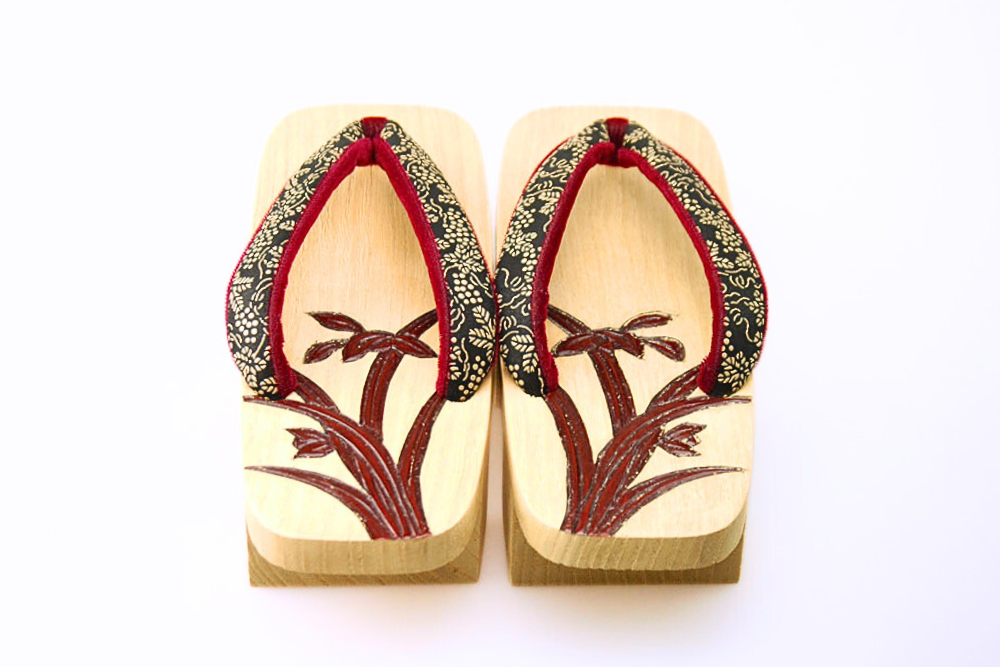 桐下駄の白木の柾目そのままを生かした上に、鎌倉彫の彫と漆で柄を刻んだ個性的なデザイン。白木に汚れが付きにくいよう磨きを施してあります。浴衣の他、紬・ウール・小紋にもお使いいただけるほか日常のお服の足元にも粋です
