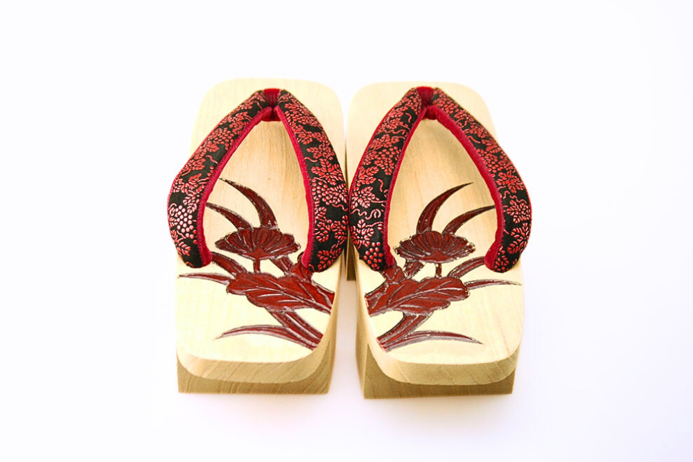桐下駄の白木の柾目そのままを生かした上に、鎌倉彫の彫と漆で柄を刻んだ個性的なデザイン。白木に汚れが付きにくいよう磨きを施してあります。浴衣の他、紬・ウール・小紋にもお使いいただけるほか日常のお服の足元にも粋です。拡大画像はこちら
