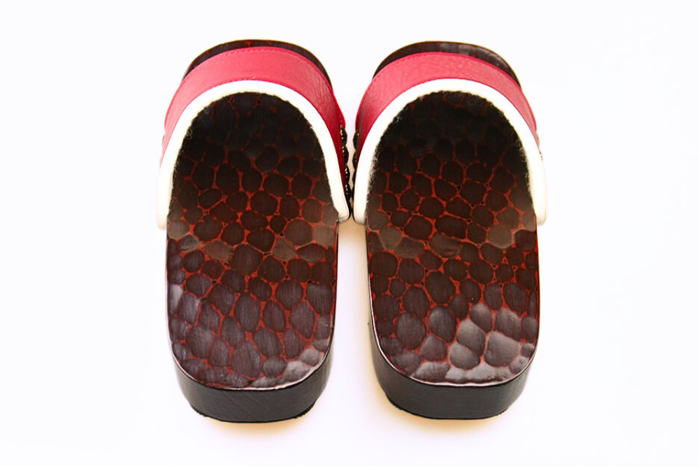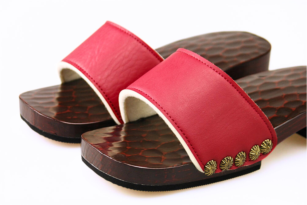 鎌倉彫らしい刀痕を生かしたシンプルな台。帯の革の裏にはクッションを付け、履きやすさも抜群です。玄関のたたきに置いてあるだけでも、昭和の古き良きハイカラな雰囲気が絵になります。サイドに並んだアンティークなビスもお洒落。