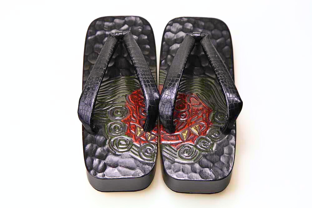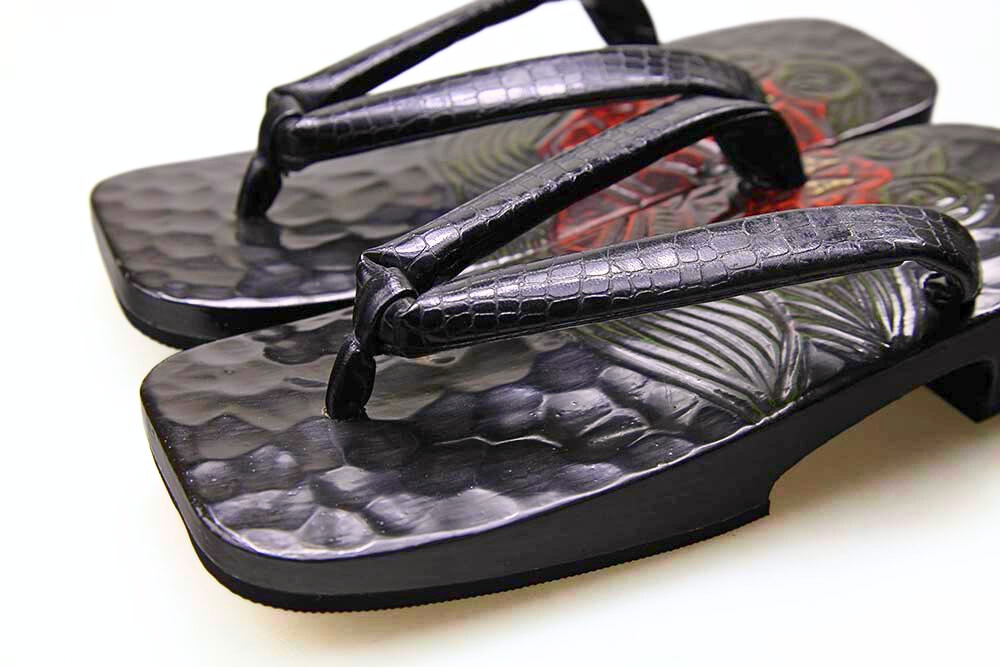 桐の台に鎌倉彫で勢いのある獅子頭柄を彫り、さらに色を差しました。華やかな鼻緒と組み合わせた粋なお下駄です。脱いだ時に柄がひと続きに完成するのも粋そのもの。鼻緒は牛革型押し。裏はゴム貼り安定感があります