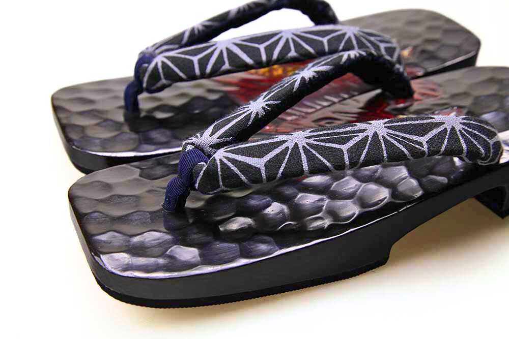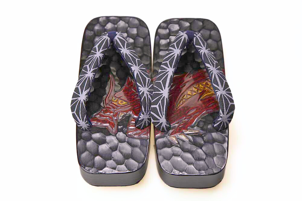 桐の台に鎌倉彫で勢いのあるドラゴン柄を彫り、さらに色を差しました。華やかな麻の葉柄の鼻緒と組み合わせた粋なお下駄です。脱いだ時に柄がひと続きに完成するのも粋そのもの。裏はゴム貼りで安定感があります