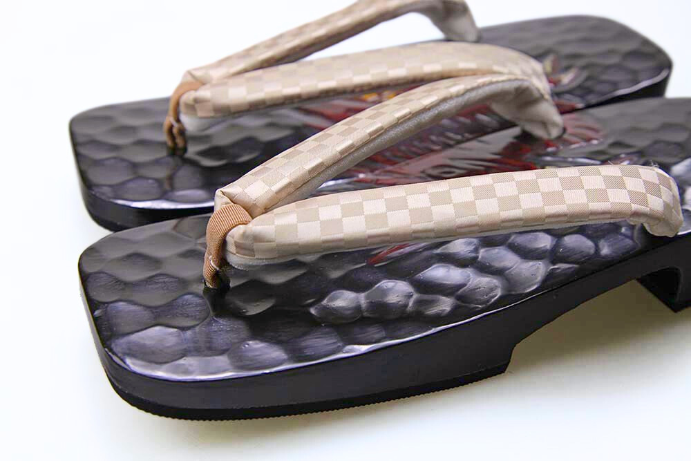 桐の台に鎌倉彫で勢いのあるドラゴン柄を彫り、さらに色を差しました。華やかな市松文様の鼻緒と組み合わせた粋なお下駄です。脱いだ時に柄がひと続きに完成するのも粋そのもの。裏はゴム貼りで安定感があります