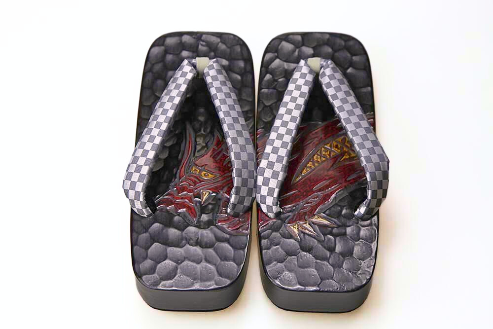 桐の台に鎌倉彫で勢いのある龍の柄を彫り、さらに色を差しました。華やかな鼻緒と組み合わせた粋なお下駄です。脱いだ時に柄がひと続きに完成するのも粋そのもの。裏はゴム貼りで安定感があります