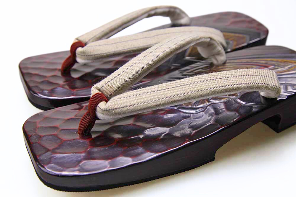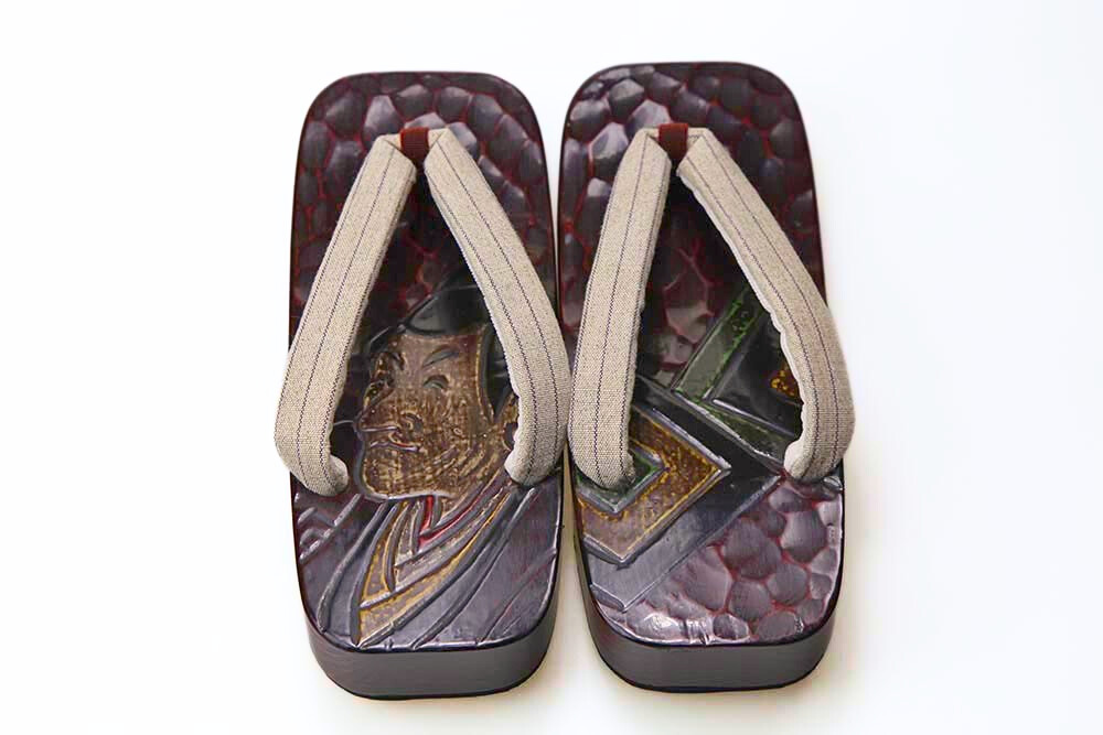 桐の台に鎌倉彫で勢いのある写楽の柄を彫り、さらに色を差しました。華やかな鼻緒と組み合わせた粋なお下駄です。脱いだ時に柄がひと続きに完成するのも粋そのもの。裏はゴム貼りで安定感があります
