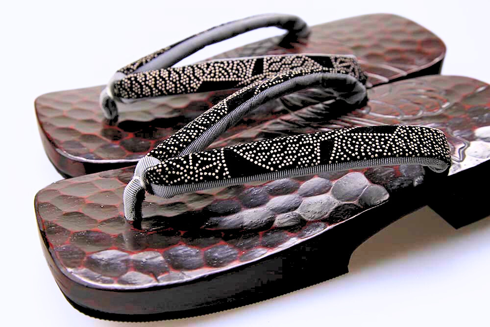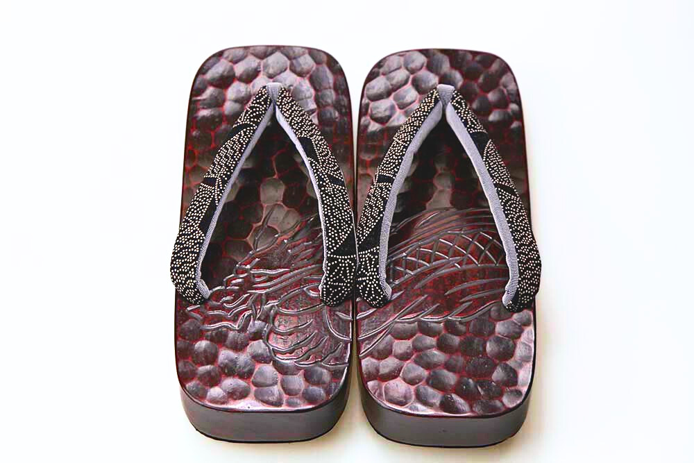 桐の台に鎌倉彫で勢いのあるドラゴンの柄を彫り、さらに色を差しました。華やかな鼻緒と組み合わせた粋なお下駄です。脱いだ時に柄がひと続きに完成するのも粋そのもの。裏はゴム貼りで安定感があります
