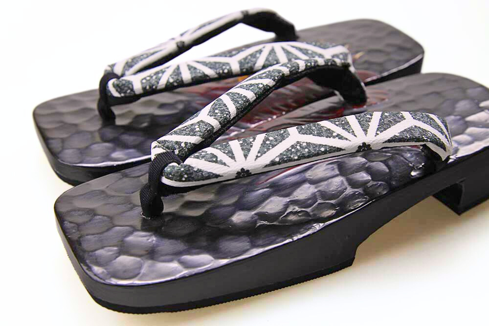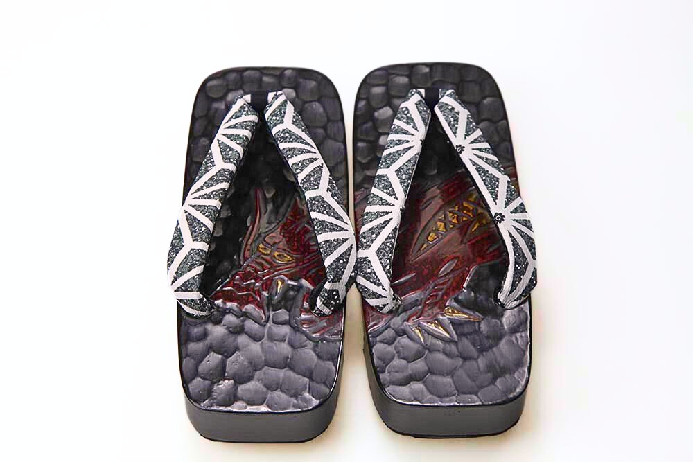 桐の台に鎌倉彫で勢いのあるドラゴンの柄を彫りました。華やかな鼻緒と組み合わせた粋なお下駄です。脱いだ時に柄がひと続きに完成するのも粋そのもの。裏はゴム貼りで安定感があります