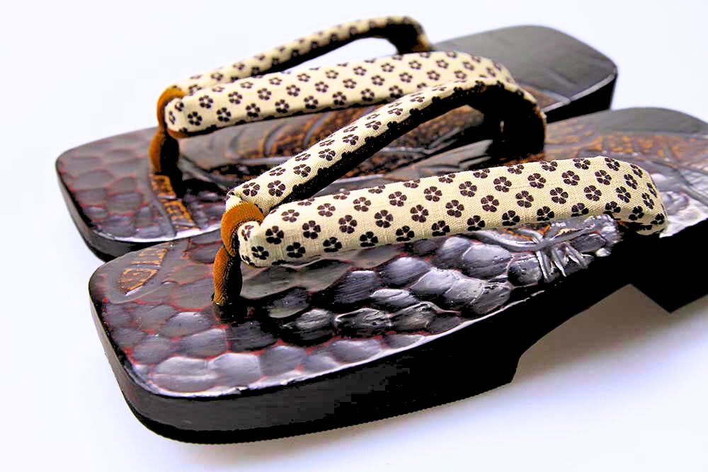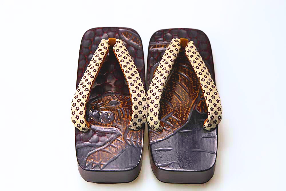 桐の台に鎌倉彫で勢いのあるタイガーの柄を彫り、さらに色を差しました。華やかな鼻緒と組み合わせた粋なお下駄です。脱いだ時に柄がひと続きに完成するのも粋そのもの。裏はゴム貼りで安定感があります