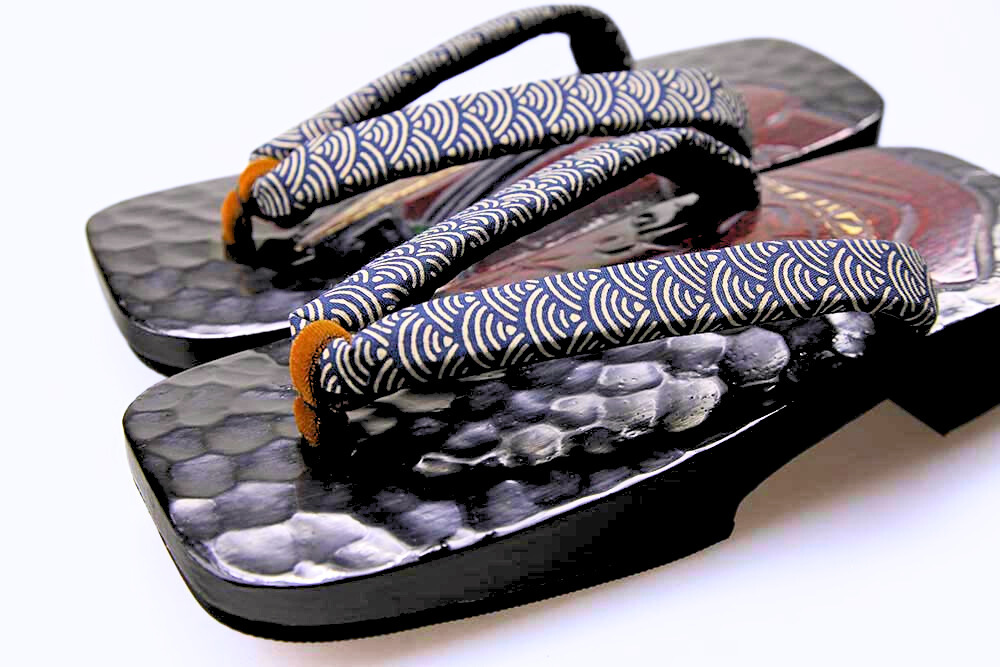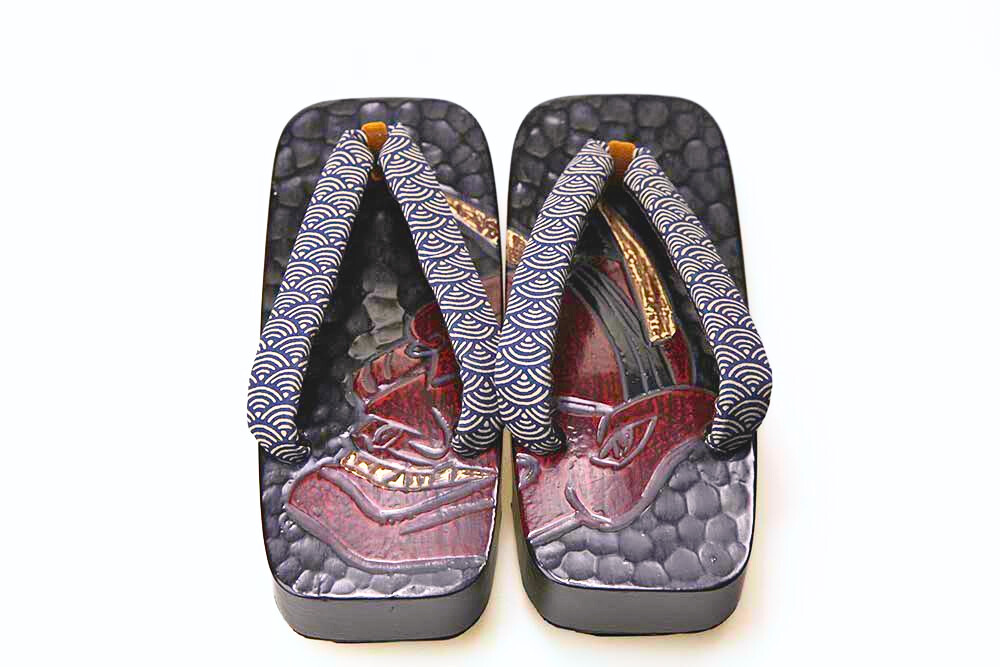 桐の台に鎌倉彫で勢いのある般若の柄を彫り、さらに色を差しました。華やかな鼻緒と組み合わせた粋なお下駄です。脱いだ時に柄がひと続きに完成するのも粋そのもの。裏はゴム貼りで安定感があります