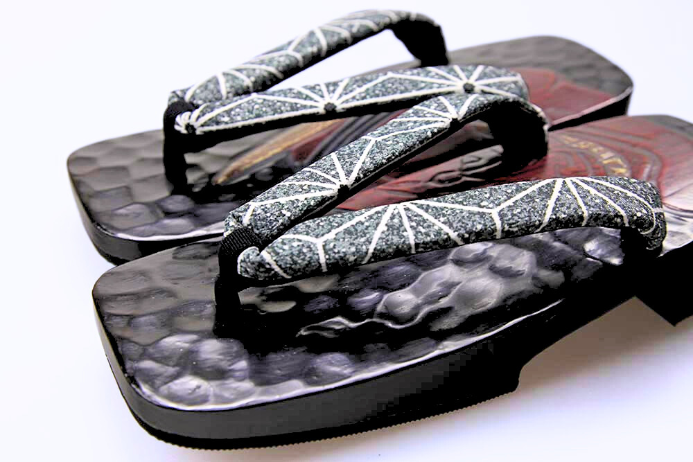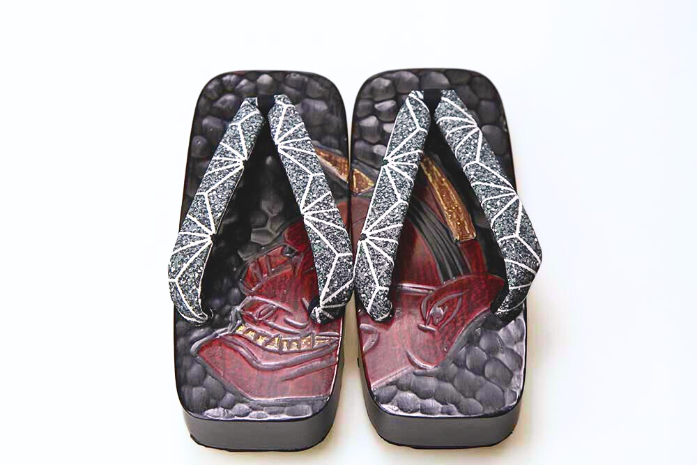 桐の台に鎌倉彫で勢いのある般若の柄を彫り、さらに色を差しました。華やかな鼻緒と組み合わせた粋なお下駄です。脱いだ時に柄がひと続きに完成するのも粋そのもの。裏はゴム貼りで安定感があります