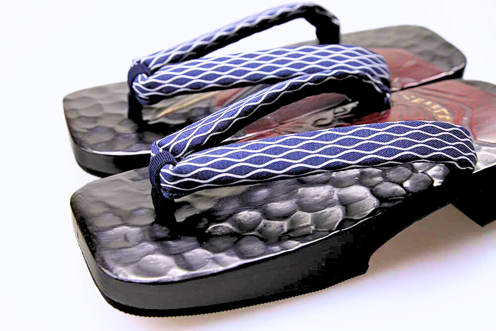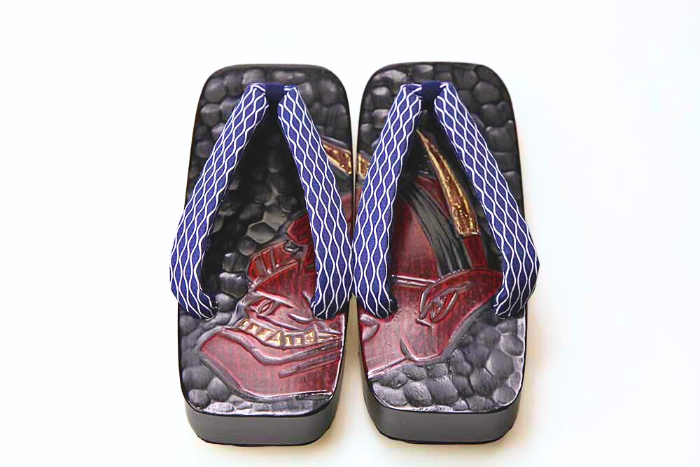 桐の台に鎌倉彫で勢いのある般若の柄を彫り、さらに色を差しました。華やかな鼻緒と組み合わせた粋なお下駄です。脱いだ時に柄がひと続きに完成するのも粋そのもの。裏はゴム貼りで安定感があります