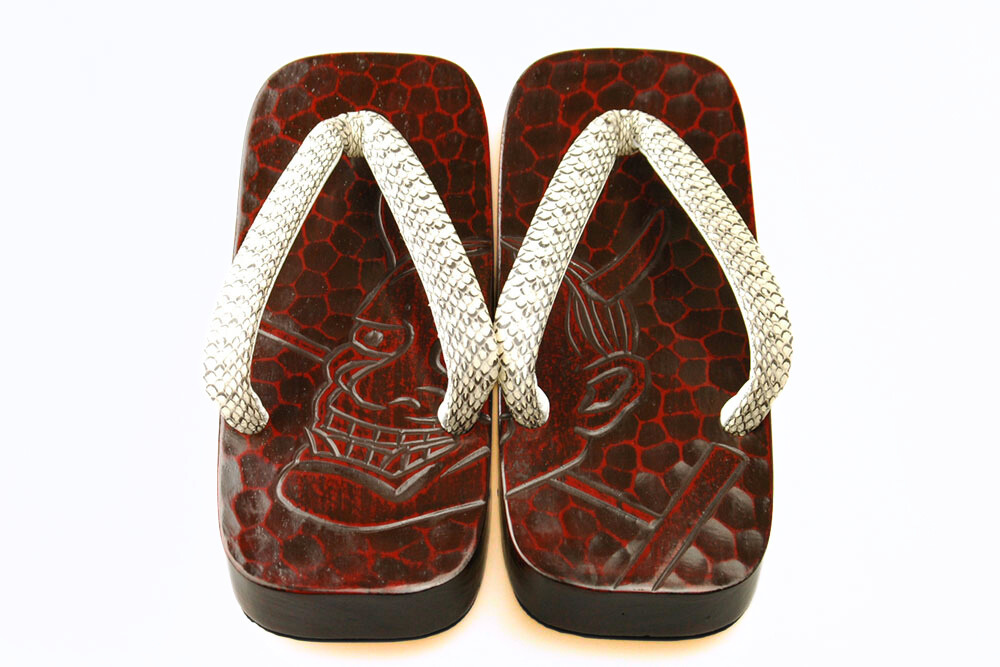 桐の台に鎌倉彫で彫られた「般若]。鼻緒はヘビ革。脱いだ時に柄がひと続きに完成するのも粋そのもの。履きやすい草履・雪駄タイプの右近下駄です