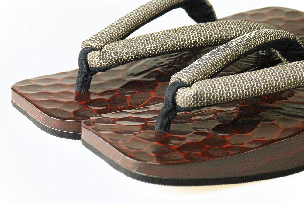 桐の台に鎌倉彫で勢いのある柄を彫り、さらに色を差しました。華やかな鼻緒と組み合わせた粋なお下駄です。脱いだ時に柄がひと続きに完成するのも粋そのもの。鼻緒は布。裏はゴム貼り