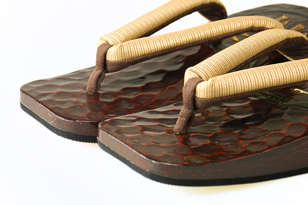 こちらの商品は、お客様のお好きな本印伝鼻緒をお選び頂き、足のサイズに合わせてお挿げする、セミオーダーメイドです。ご注文後メールにて、お挿げする鼻緒の写真を数種類送りいたしますので、写真を見ながらご自宅でゆっくり鼻緒をお選びください。