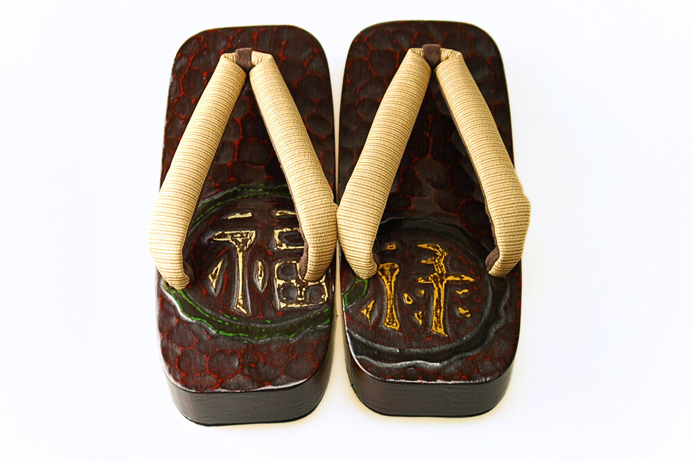 桐の台に鎌倉彫で勢いのある柄を彫り、さらに色を差しました。華やかな鼻緒と組み合わせた粋なお下駄です。脱いだ時に柄がひと続きに完成するのも粋そのもの。鼻緒は布。裏はゴム貼り