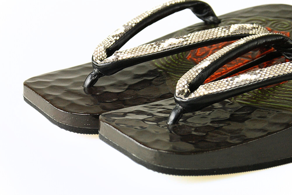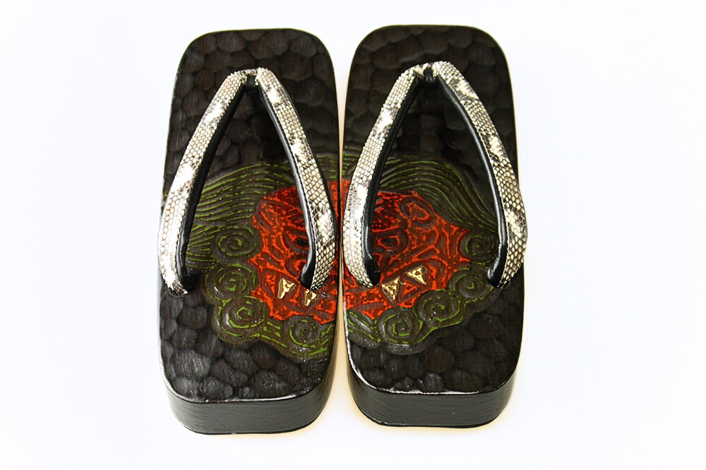 桐の台に鎌倉彫で勢いのある柄を彫り、さらに色を差しました。華やかな鼻緒と組み合わせた粋なお下駄です。脱いだ時に柄がひと続きに完成するのも粋そのもの。鼻緒はトカゲ。裏はゴム貼り