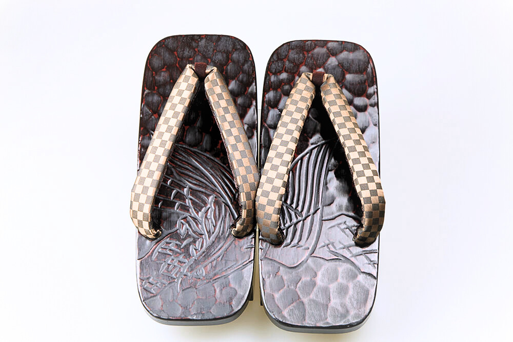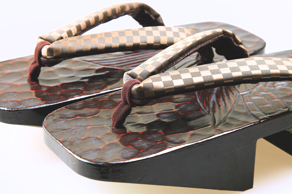 江戸の昔、花型の千両役者が好んで履いたことから名の付いた千両、またの名を「のめり」下駄。前の歯が斜めになっているため歩きやすいと評判です。艶やかな漆に彫られた妖艶な「タカ」。脱いだ時に柄がひと続きに完成するのも粋そのもの。