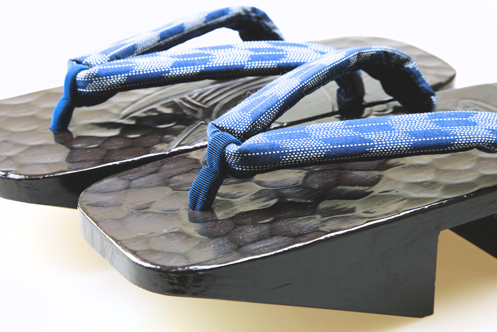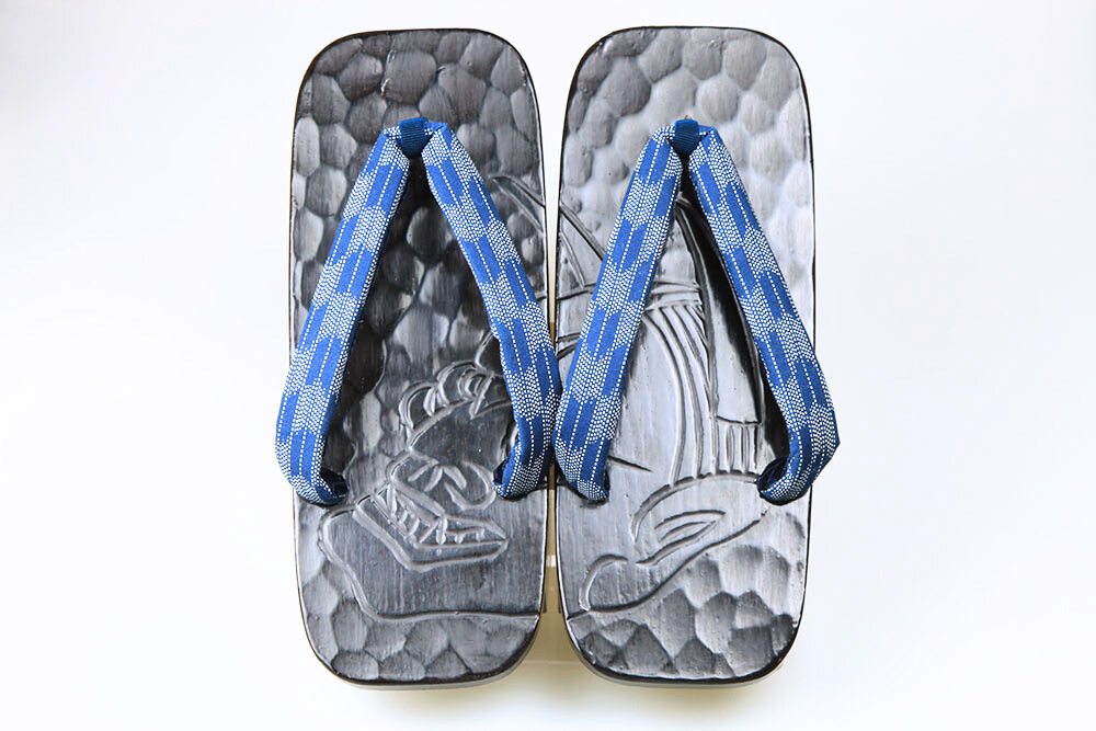 江戸の昔、花型の千両役者が好んで履いたことから名の付いた千両、またの名を「のめり」下駄。前の歯が斜めになっているため歩きやすいと評判です。艶やかな漆に彫られた妖艶な「般若」。脱いだ時に柄がひと続きに完成するのも粋そのもの