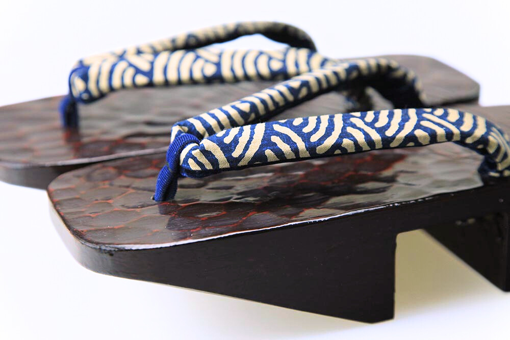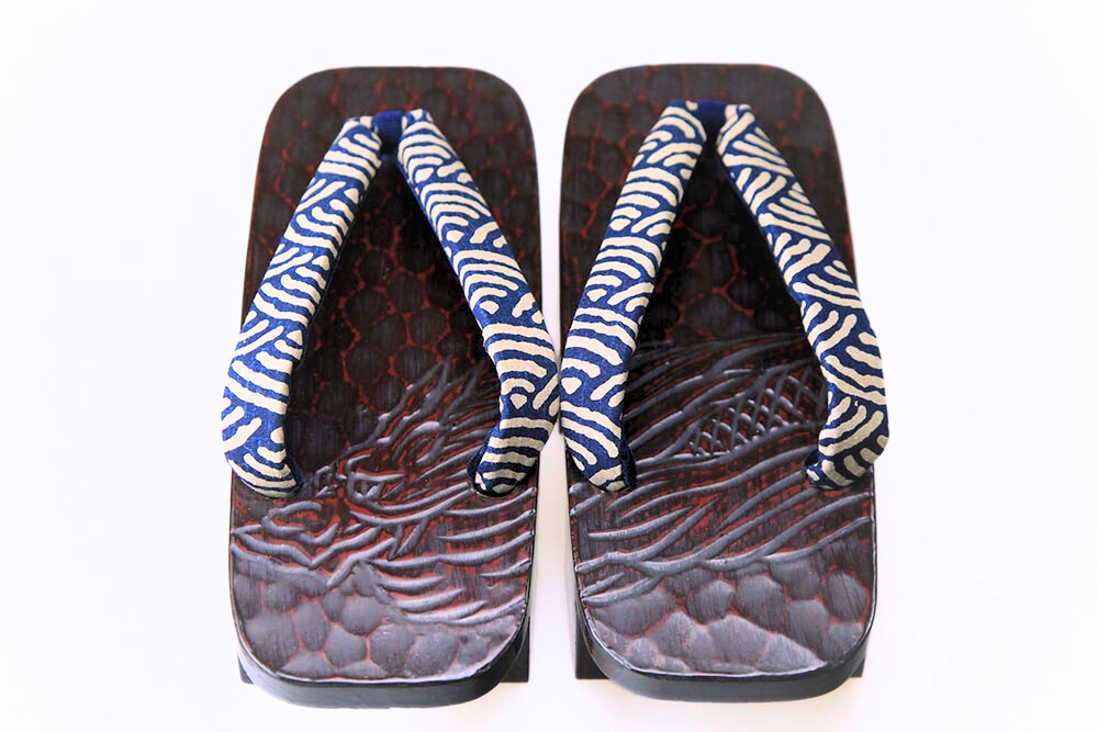 江戸の昔、花型の千両役者が好んで履いたことから名の付いた千両、またの名を「のめり」下駄。前の歯が斜めになっているため歩きやすいと評判です。艶やかな漆に彫られた「ドラゴン」。脱いだ時に柄がひと続きに完成するのも粋そのもの。