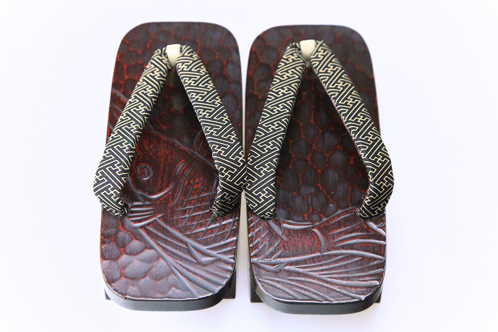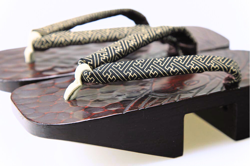 江戸の昔、花型の千両役者が好んで履いたことから名の付いた千両、またの名を「のめり」下駄。前の歯が斜めになっているため歩きやすいと評判です。艶やかな漆に彫られた「鯉」。脱いだ時に柄がひと続きに完成するのも粋そのもの。