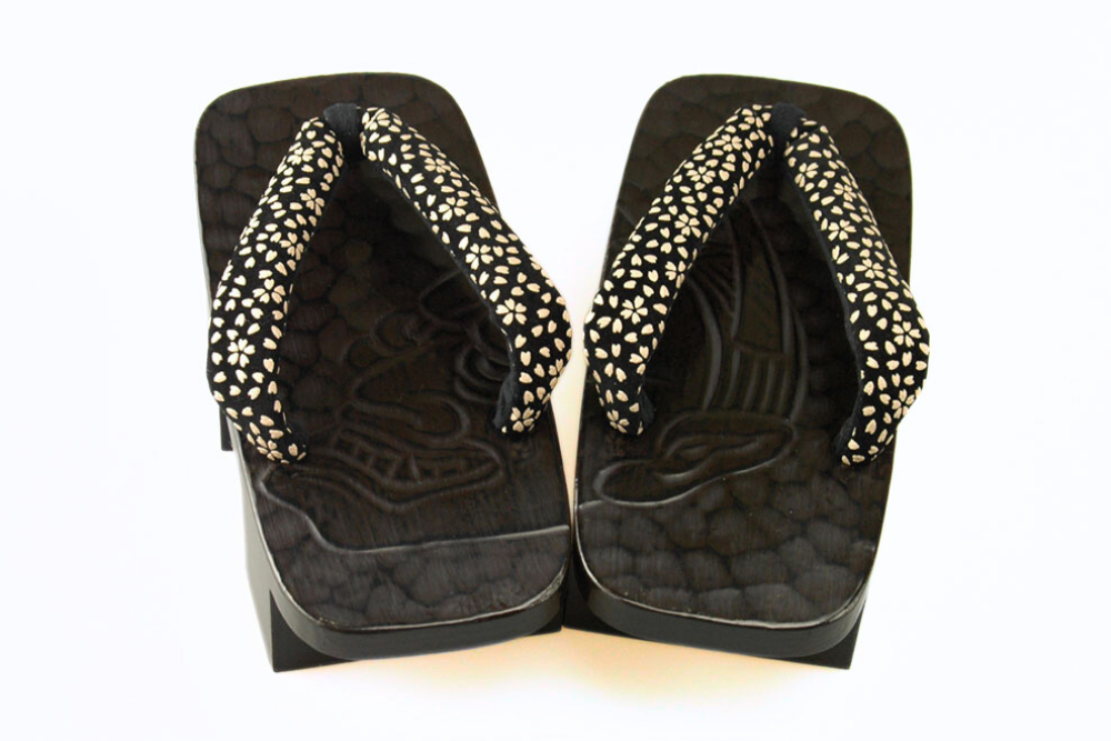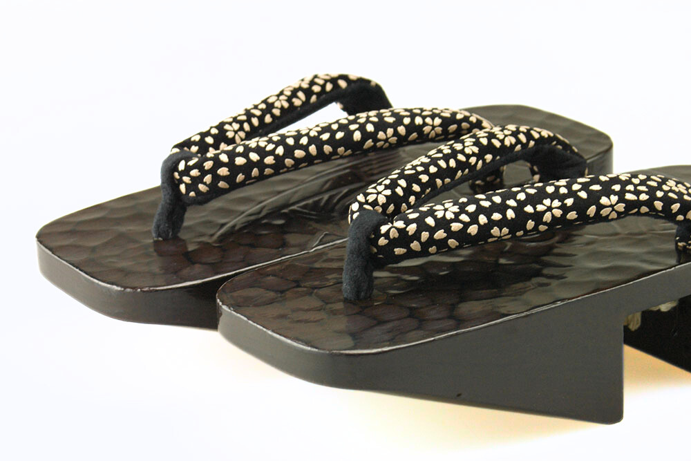 江戸の昔、花型の千両役者が好んで履いたことから名の付いた千両、またの名を「のめり」下駄。前の歯が斜めになっているため歩きやすいと評判です。艶やかな漆に彫られた妖艶な鎌倉彫の「般若」。脱いだ時に柄がひと続きに完成するのも粋そのもの。鼻緒は布・桜
