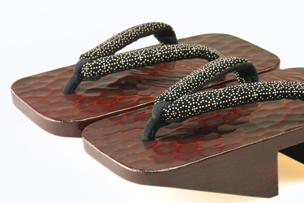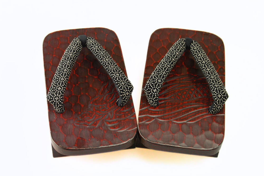 江戸の昔、花型の千両役者が好んで履いたことから名の付いた千両、またの名を「のめり」下駄。前の歯が斜めになっているため歩きやすいという評判も。艶やかな漆に彫られた雄々しい「龍」。脱いだ時に柄がひと続きに完成するのも粋そのもの