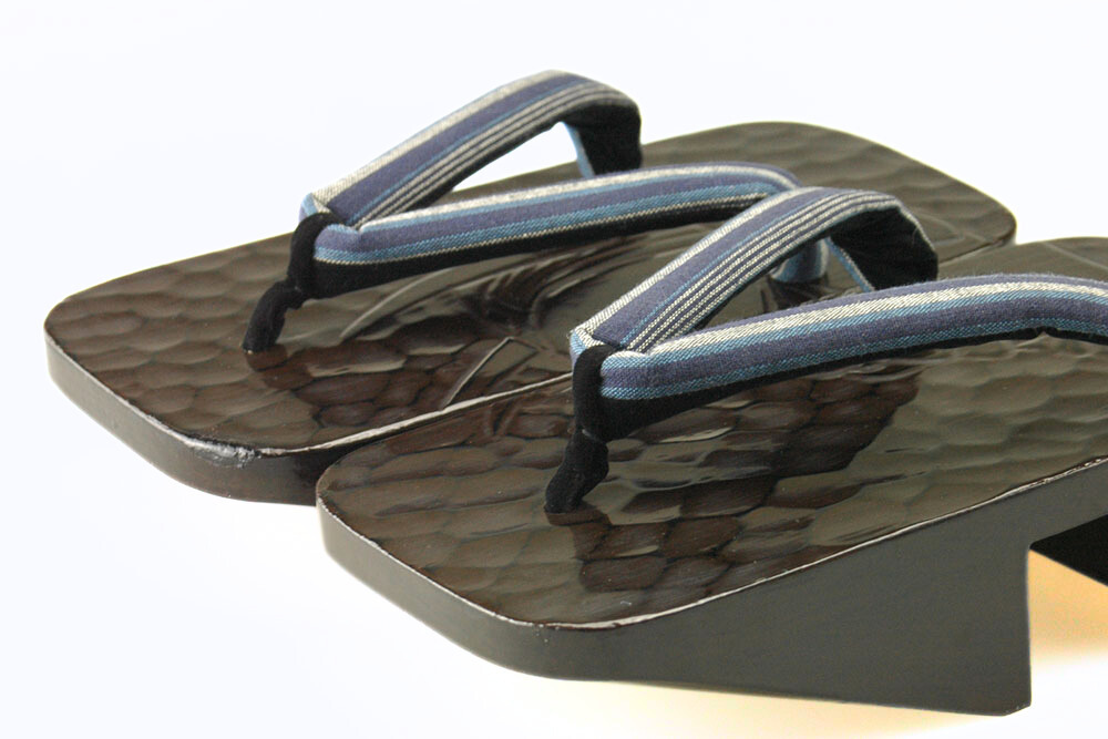 江戸の昔、花型の千両役者が好んで履いたことから名の付いた千両、またの名を「のめり」下駄。前の歯が斜めになっているため歩きやすいという評判も。艶やかな漆に彫られた雄々しい「般若」。脱いだ時に柄がひと続きに完成するのも粋そのもの。鼻緒は縞