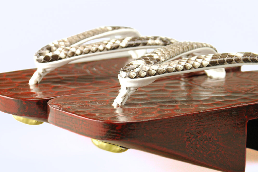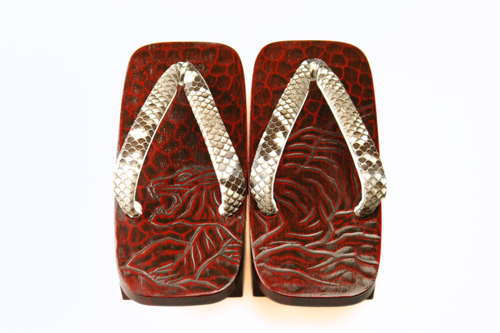 江戸の昔、花型の千両役者が好んで履いたことから名の付いた千両、またの名を「のめり」下駄。前の歯が斜めになっているため歩きやすいという評判も。艶やかな漆に彫られた凛とした鎌倉彫の「虎」。脱いだ時に柄がひと続きに完成するのも粋そのもの。鼻緒はヘビ。