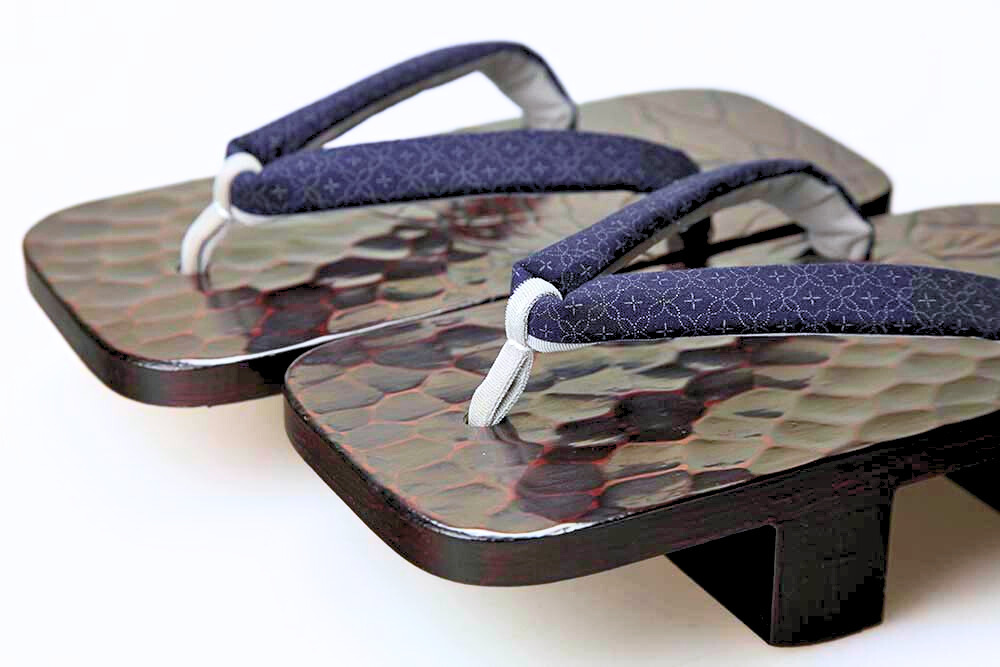 桐の台に鎌倉彫で彫られた「タイガー」。履きやすい洒落た二本歯下駄に仕上がっています。脱いだ時に柄がひと続きに完成するのも粋そのもの