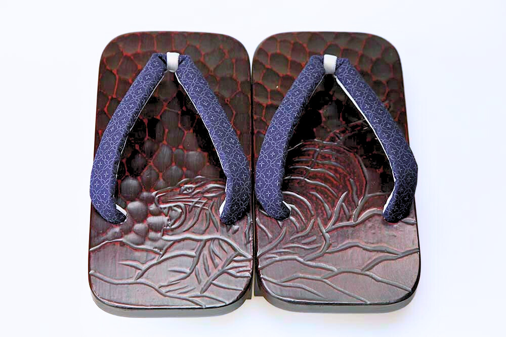 桐の台に鎌倉彫で彫られた「タイガー」。履きやすい洒落た二本歯下駄に仕上がっています。脱いだ時に柄がひと続きに完成するのも粋そのもの